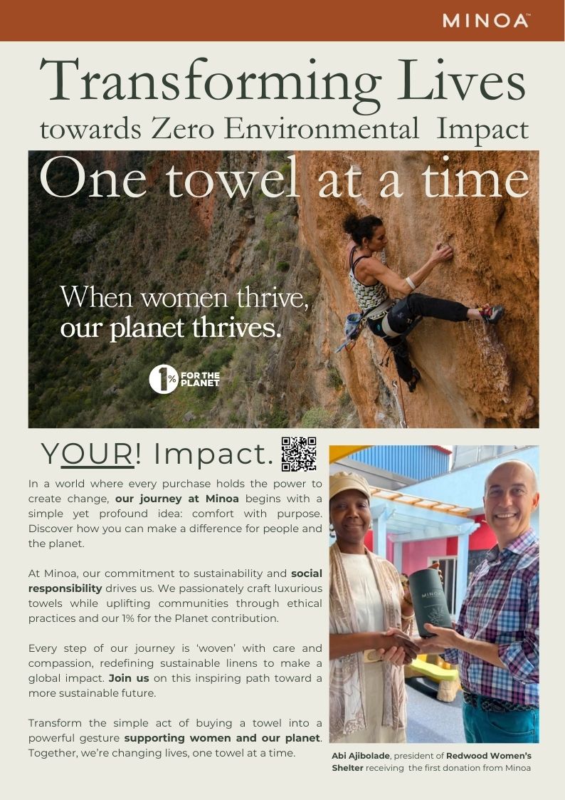 Minoa is dedicated to empowering women, both locally and globally. For every towel sold directly to consumers, we donate one to women’s shelters in the US and Canada, supporting SDG #5 to empower women and girls. Furthermore, our production chain primarily employs women (80%), ensuring they are empowered through fair employment practices.